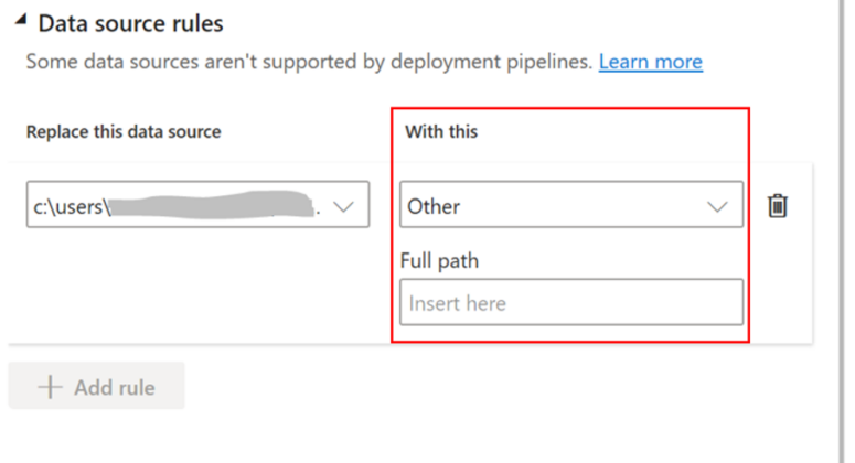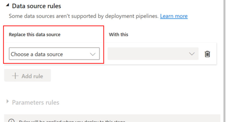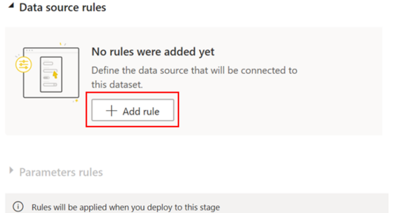 Les règles d’ensemble de données sont définies sur les sources de données et les paramètres, dans chaque ensemble de données. Ils déterminent les valeurs des sources de données ou des paramètres d’un ensemble de données spécifique. Par exemple, si vous voulez qu’un ensemble de données dans une étape de production pointe vers une base de données de production, vous pouvez définir une règle pour cela. La règle est définie à l’étape de la production, sous l’ensemble de données approprié. Une fois la règle définie, le contenu déployé du test à la production héritera de la valeur définie dans les règles de l’ensemble de données, et s’appliquera toujours ainsi tant que la règle est inchangée et reste valide.