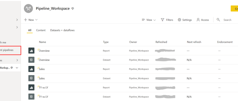 Une fois que vous avez créé votre espace de travail et ajouté votre contenu, sélectionnez Deployment pipelines à gauche dans le navigateur.