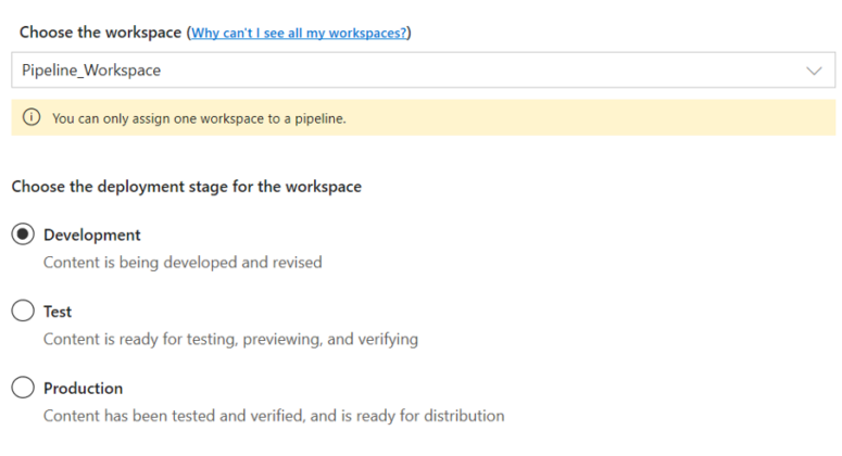 REMARQUE : Vous ne pouvez attribuer qu’un seul espace de travail à un pipeline de déploiement. Les pipelines de déploiement créeront ensuite des clones du contenu de l’espace de travail, qui seront utilisés aux différentes étapes du pipeline.