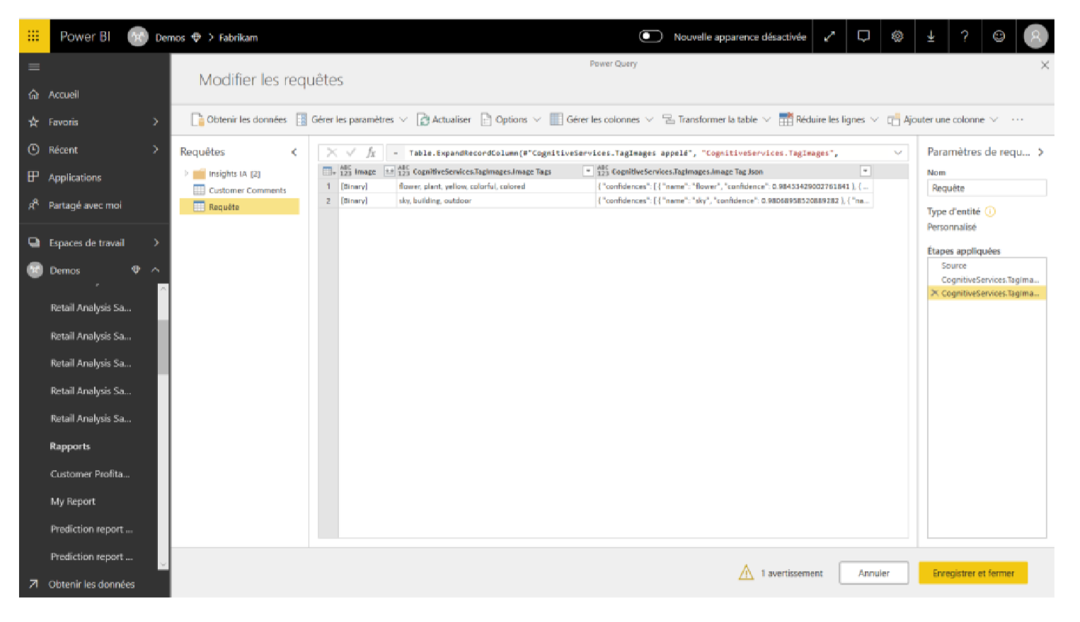 Quand il s’agit d’inclure cette fonctionnalité dans Power BI, il est hautement recommandé d’héberger les images en ligne (Cloud par exemple) et de passer les Urls en Power Queries en utilisant la fonction Web.Contents() afin de les charger sous forme de fichiers binaires. Une fois que nous avons fini de charger et structurer ces URL dans une colonne dans Power Query, il suffit de sélectionner Cognitive services.Tagimages et de choisir la colonne appropriée de la source de données, comme sur l’image ci-dessous.