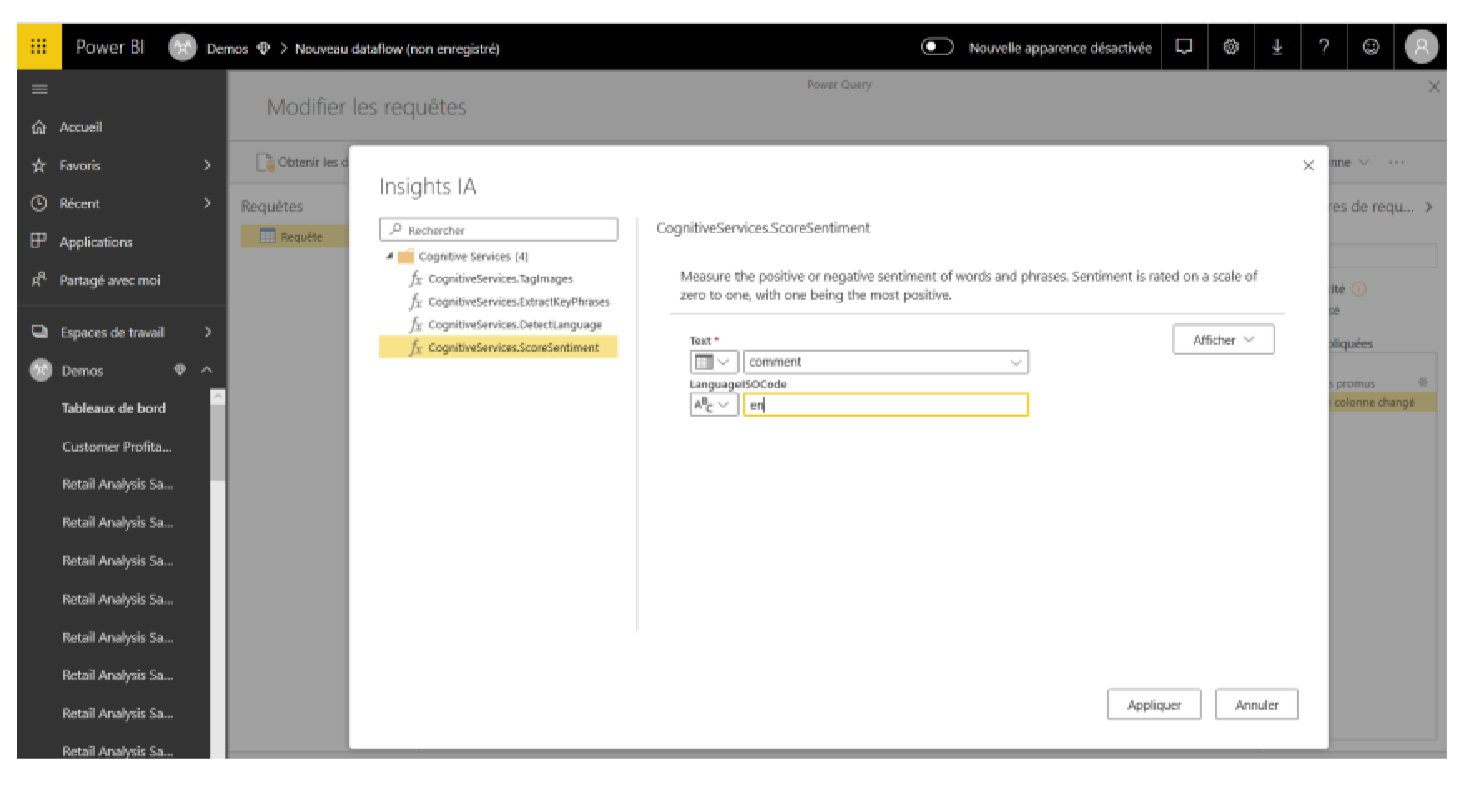 Les trois fonctions des services cognitifs ci-dessus pour l’analyse de texte fonctionneront avec n’importe quel champ de texte. Une fois que vous chargez votre source de données, sélectionnez la colonne de texte appropriée, comme nous l’avons fait plus tôt avec l’étiquetage des images, puis choisissez entre les trois fonctions : CognitiveServices.ExtractKeyPhrases, CognitiveServices.DetectLanguage, ou Cognitiveservices.ScoreSentiment.