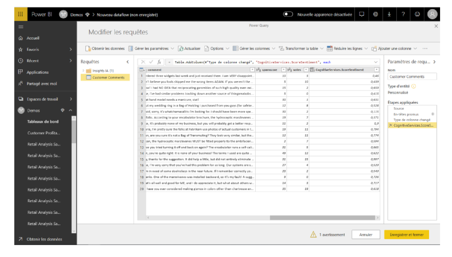 Ces données, telles que les commentaires de vos clients sur les réseaux sociaux ou encore les retours de vos collaborateurs via enquêtes pourraient être très utiles. Avant, il était difficile d’obtenir des aperçus de ce type de données, mais aujourd’hui, grâce à l’intégration de l’IA dans Power BI, nous pouvons bénéficier d’une meilleure analyse pour notre stratégie d’entreprise.