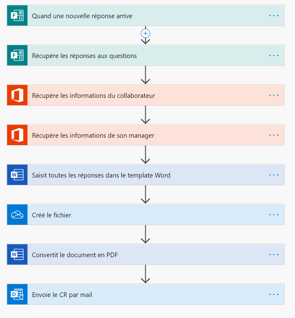 - Les réponses sont synthétisées sous la forme d’un document automatiquement généré qui est envoyé au collaborateur et à son manager à l’aide d’un Power Automate